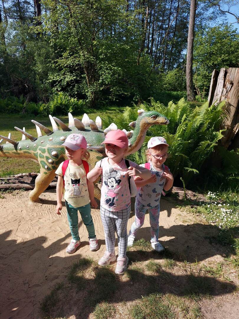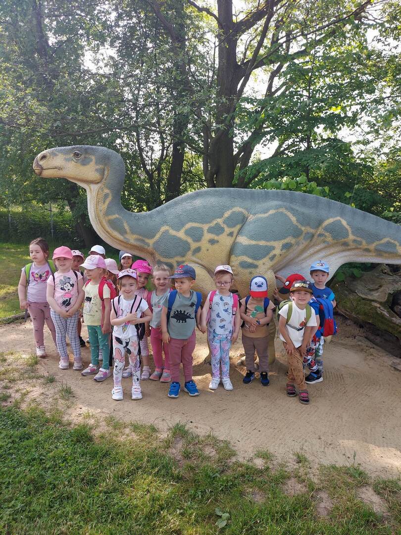 29 maja 2023r dzieci z grupy „ Sówki” pojechały na wycieczkę do Dino Parku w Kołacinku. Nadrzędnym celem wycieczki było wzbogacenie wiedzy przyrodniczej, w tym ekologicznej ze szczególnym uwzględnieniem tematyki dinozaurów. Rekonstrukcje okazów prehistorycznych gadów i ich wielkość były bardzo realistyczne. Wzbudziły one ogromne zainteresowanie u dzieci, które dowiedziały się m.in.: o warunkach, w jakim żyły dinozaury, czym się żywiły i dlaczego wyginęły. Fantastyczną zabawą okazała się również wizyta w „Lodowej krainie” oraz „Małpim gaju” gdzie nasze Sówki wykazały się dużą sprawnością fizyczna, odwagą i zręcznością. Atrakcjom tego dnia nie było końca. Bawiły się na placu zabaw, zjeżdżały na dmuchanych zamkach, Na zakończenie „Sówki” odwiedziły „Bajkową ścieżkę” gdzie poznały bohaterów najpiękniejszych bajek . Czas spędzony na terenie Dino - Parku zostawił po sobie wiele miłych wrażeń oraz istotnych informacji o prehistorii Ziemi, a zwłaszcza o życiu fascynujących zwierząt, jakimi były dinozaury.