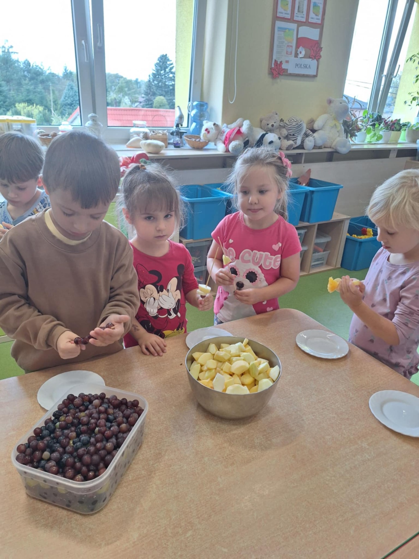 Dużo radości sprawiło dzieciom wspólne przygotowywanie owocowych szaszłyków oraz owocowej sałatki. Każdy przedszkolak przyniósł owoc, który następnie został obrany, pokrojony i dodany do dużej miski. Powstała z tego prawdziwa bomba witaminowa!