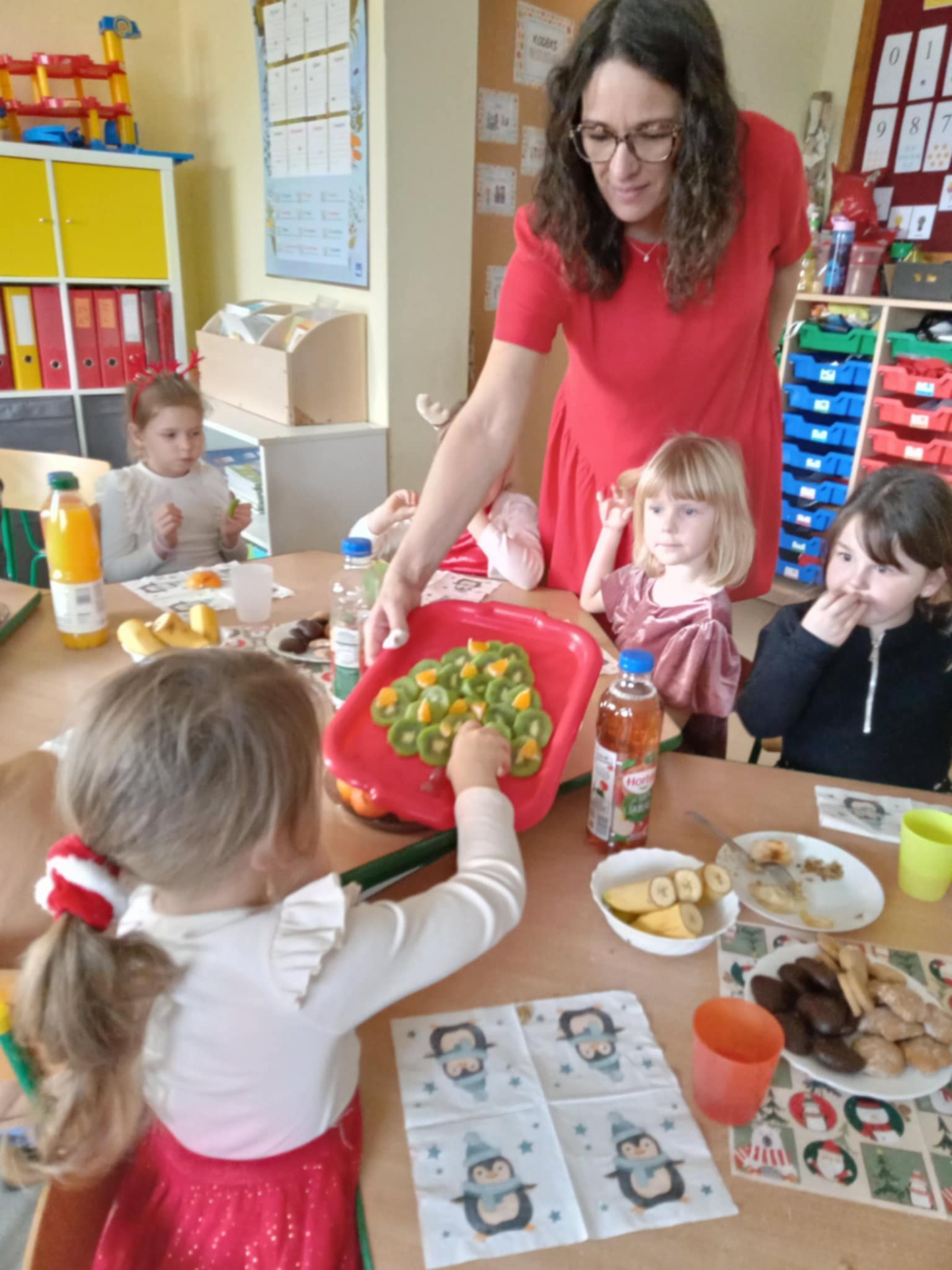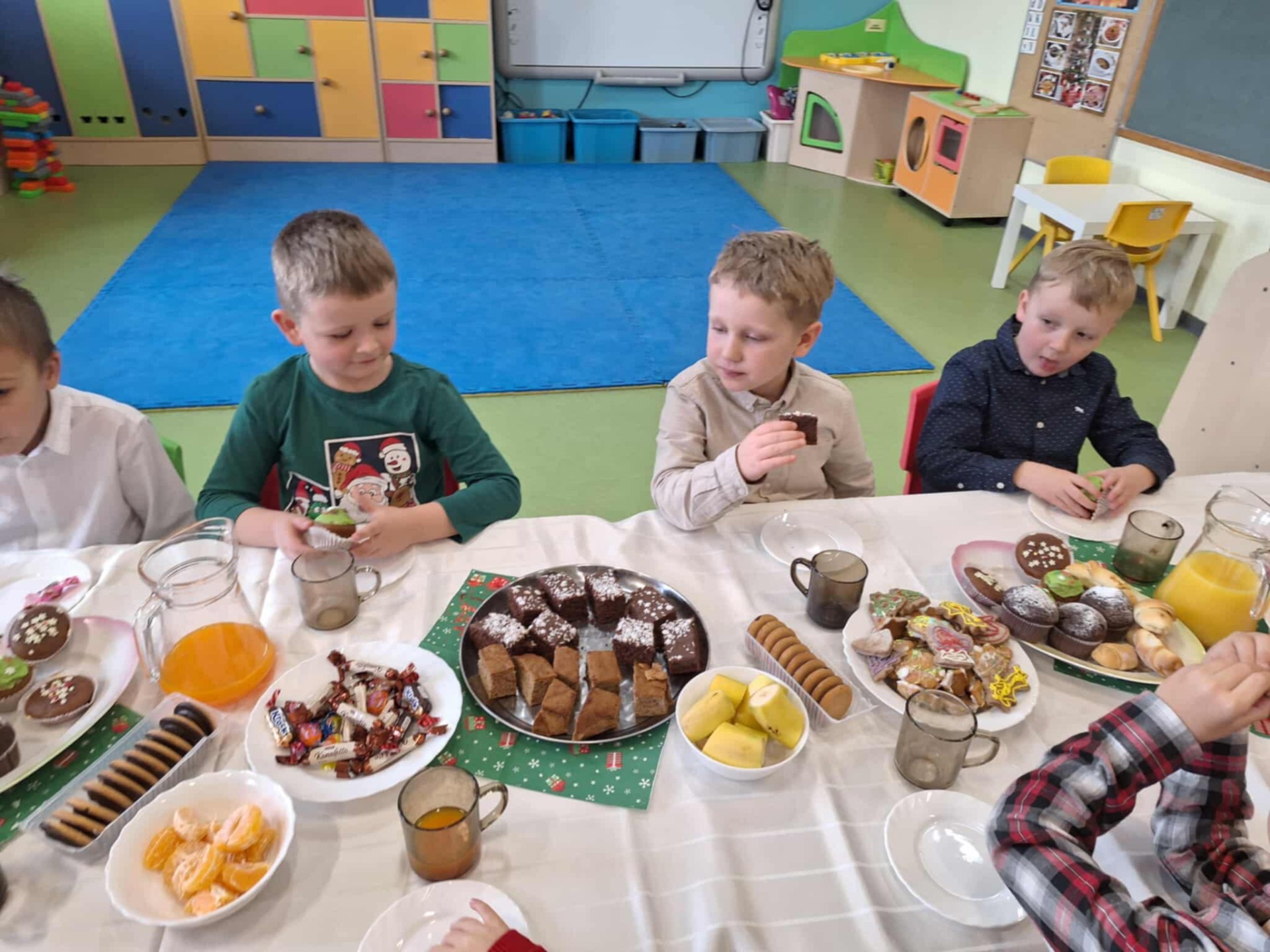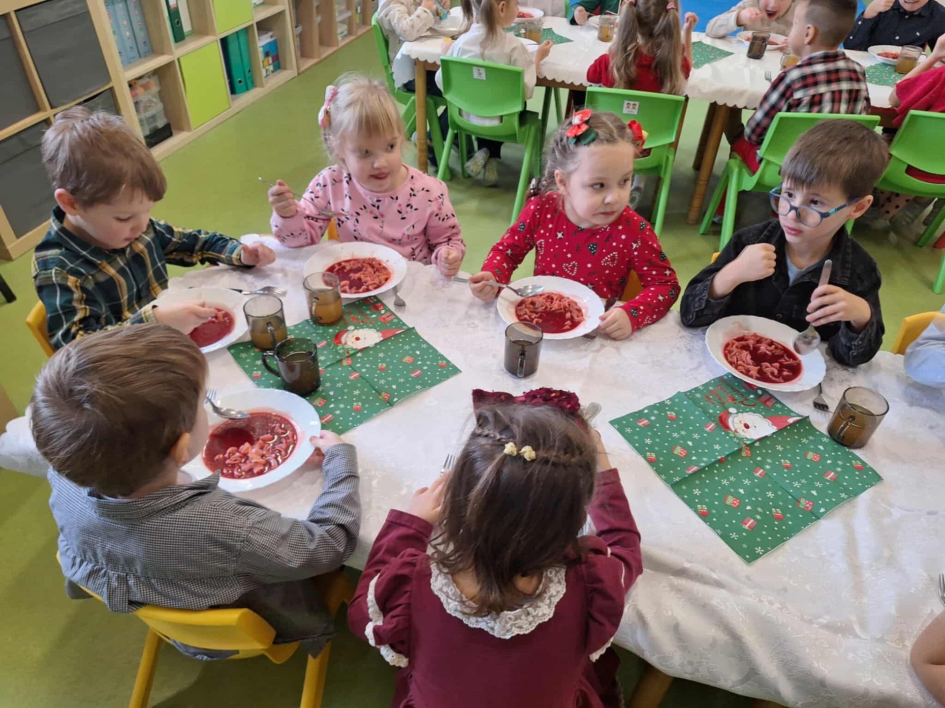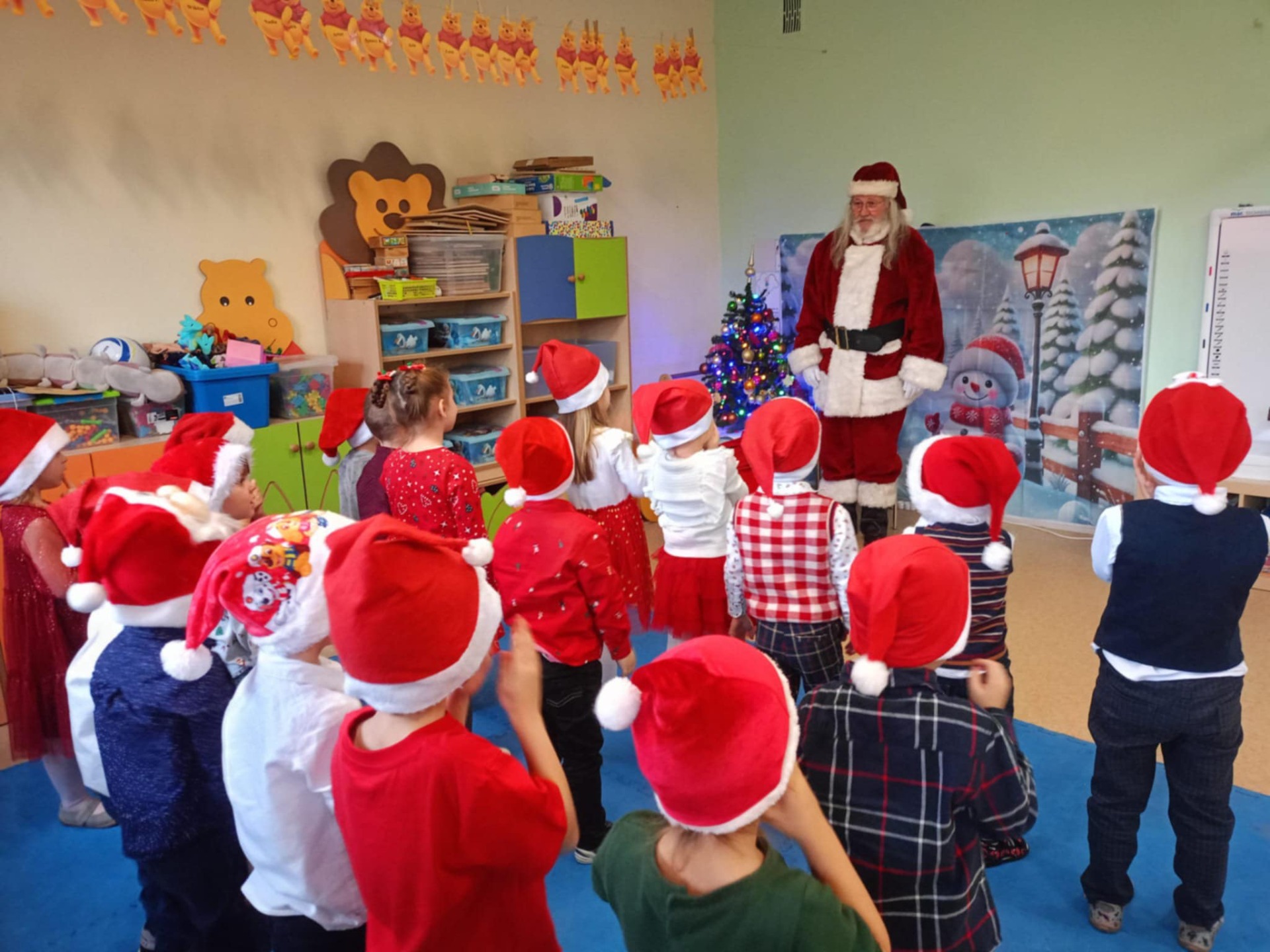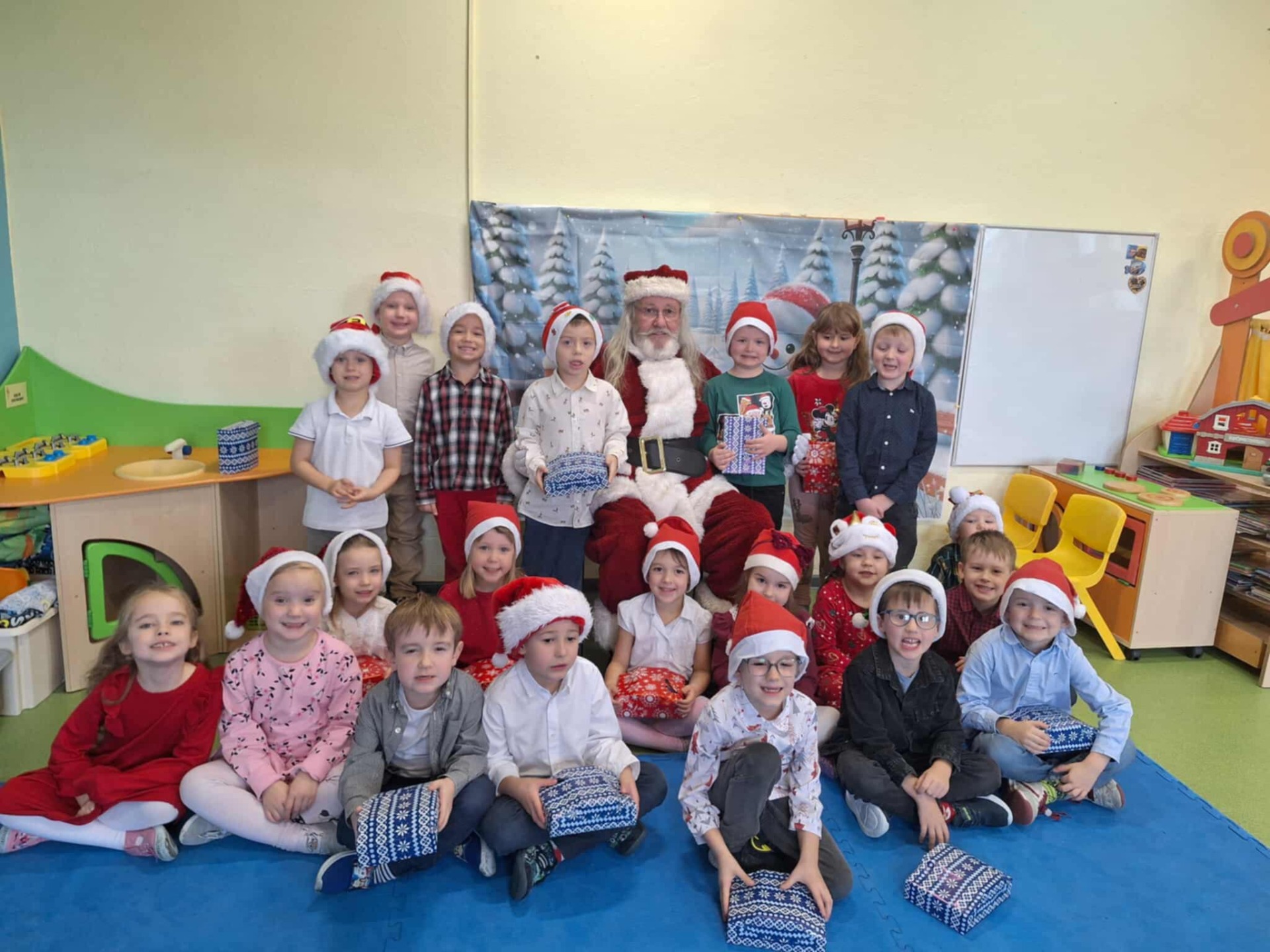 8 grudnia nasze przedszkole odwiedził Święty Mikołaj! Dzieci z radością przywitały wyjątkowego gościa, śpiewając świąteczne piosenki. Mikołaj wręczył każdemu dziecku piękny prezent, a na twarzach przedszkolaków pojawiły się szerokie uśmiechy. Po spotkaniu odbył się uroczysty, świąteczny obiad, podczas którego panowała miła, radosna atmosfera. To był wyjątkowy dzień, pełen emocji i niezapomnianych wrażeń!