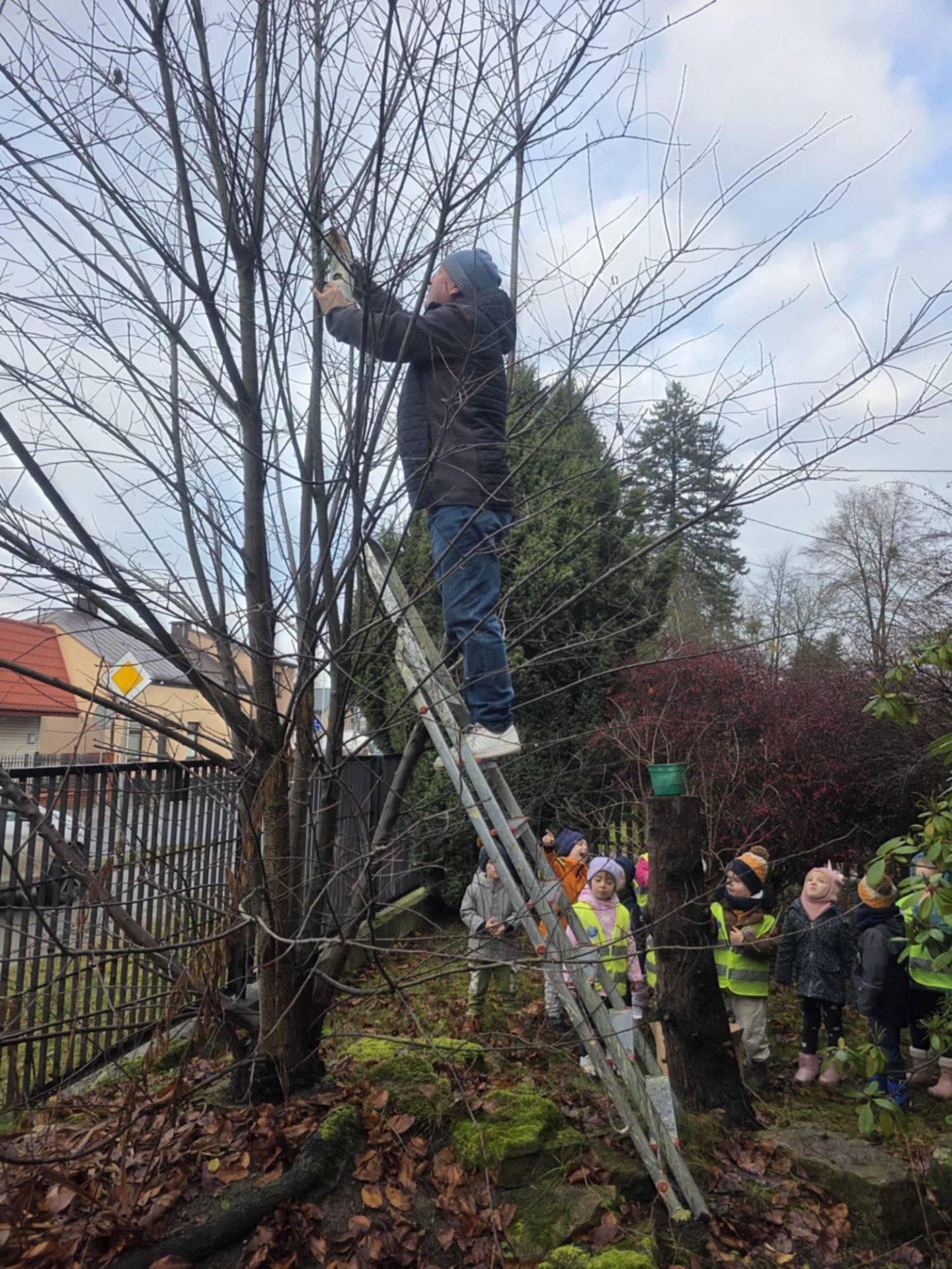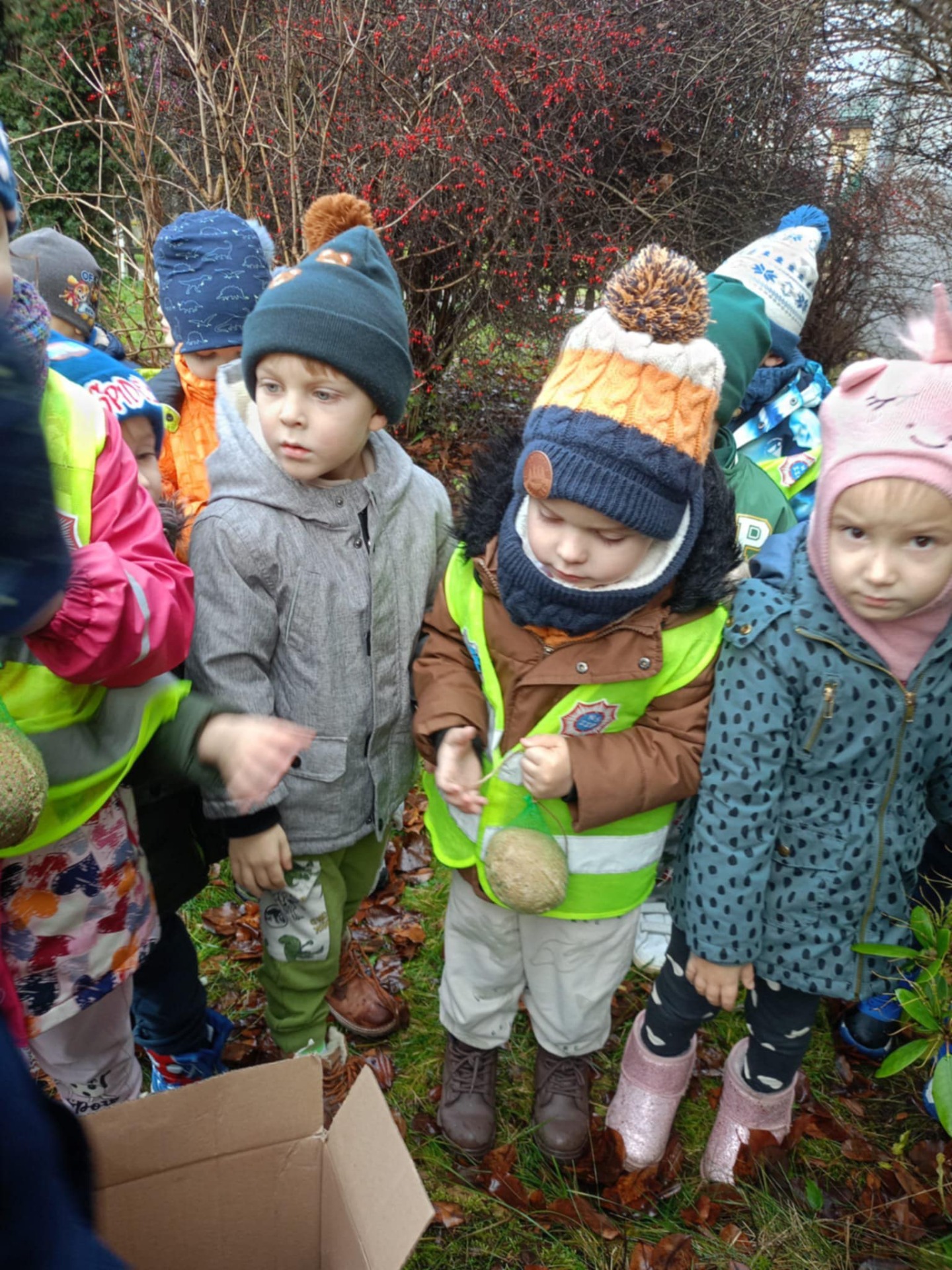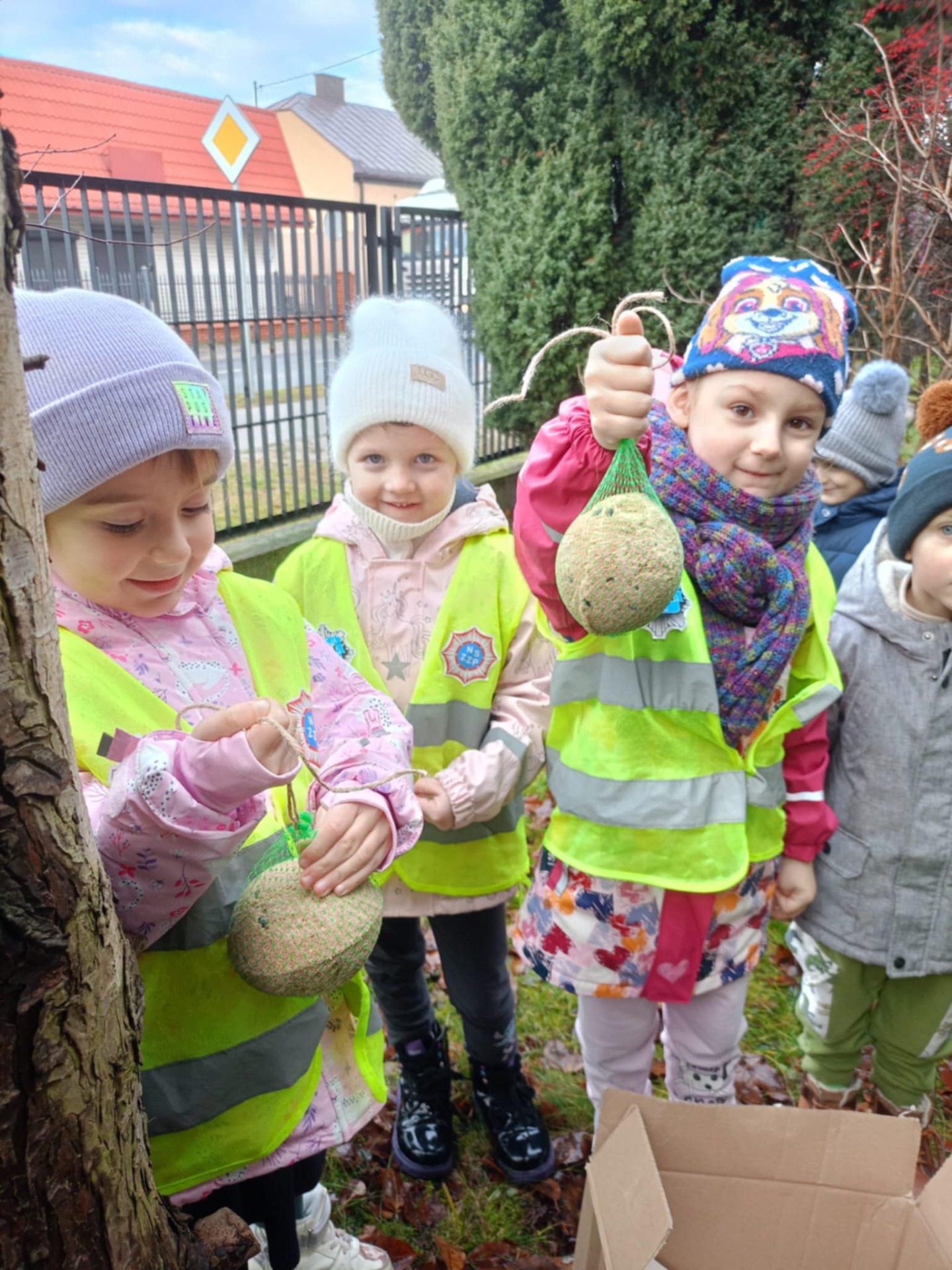 W środę dzieci z grupy Kangurki rozpoczęły dokarmianie ptaków. Z pomocą pana Tomka zawiesiły na drzewie przed przedszkolem ulubione jedzenie sikorek i wróbli- kule pełne ziaren słonecznika, orzechów i zbóż.
